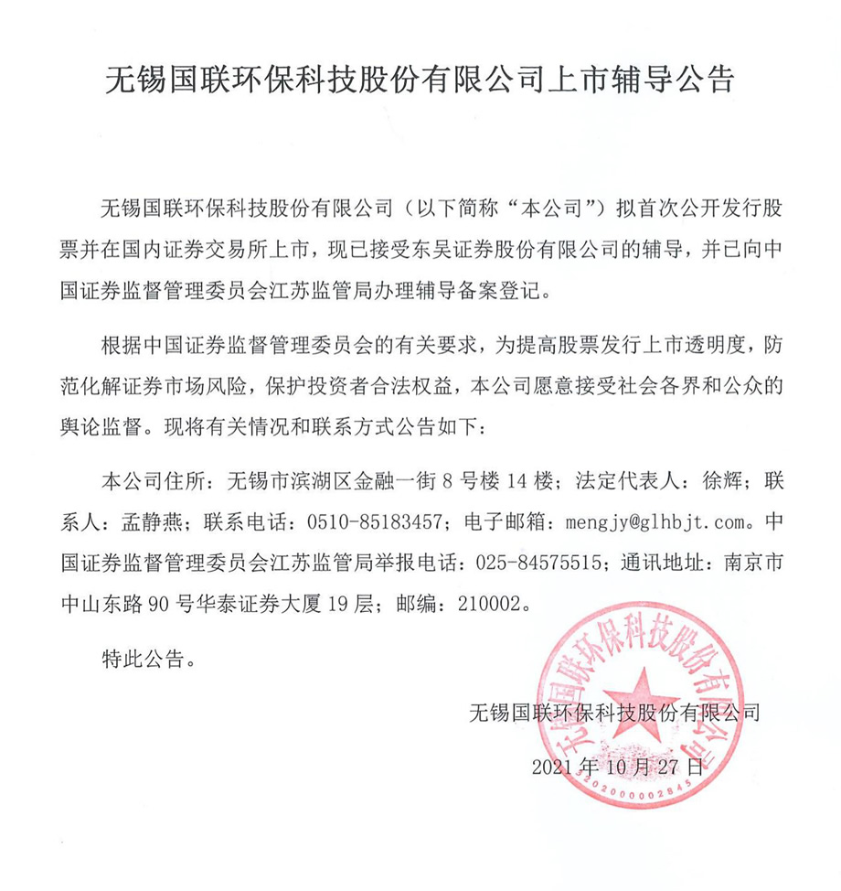 無錫國聯環保科技股份有限公司上市輔導公告